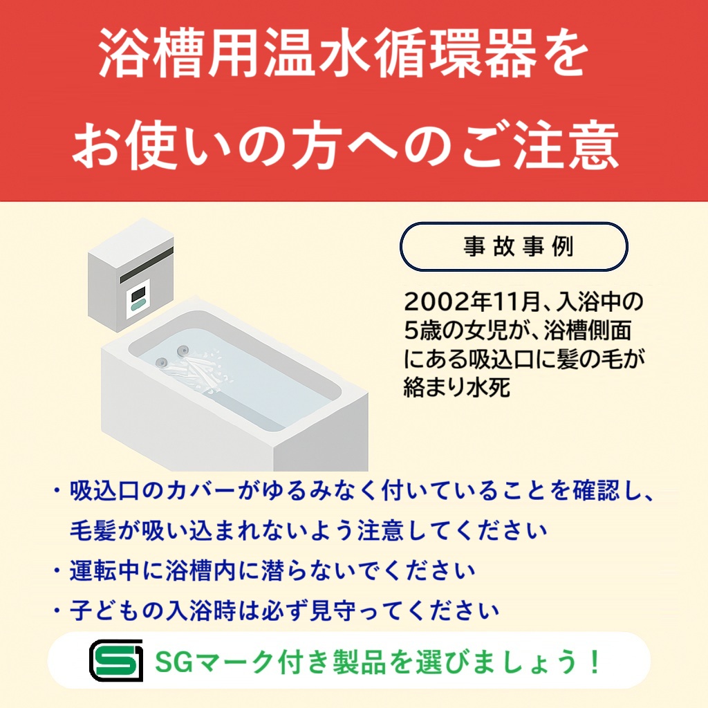 浴槽用温水循環器をお使いの方、あるいは、ご購入予定の方は、製品にSGマークがついているかご確認ください。