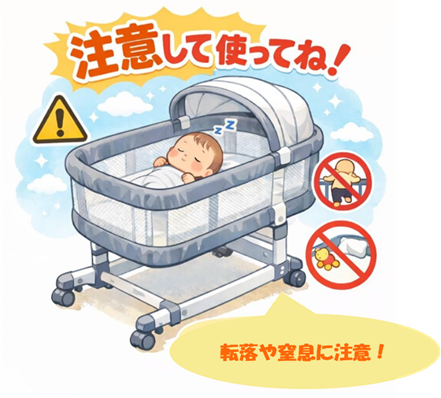 また、使用上の重要な注意の一つとして、掛け布団など柔らかい寝具は、口鼻を塞いだり首や体に巻き付いて赤ん坊が窒息死することがあるので、できる限り使用しないようにしてください。