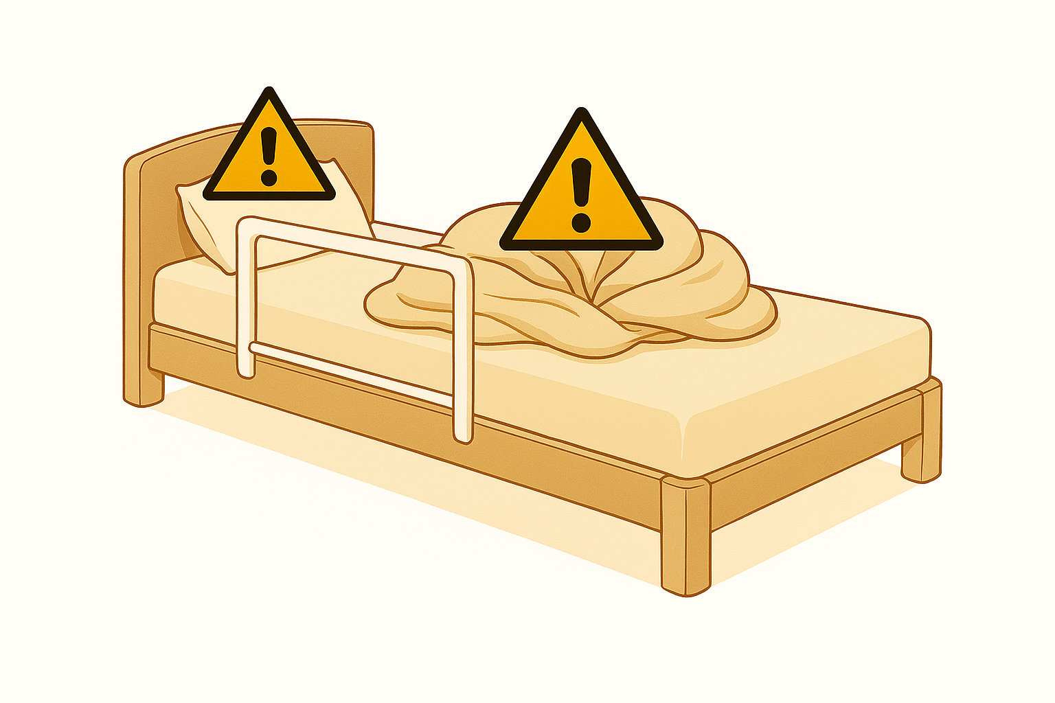 そもそも、ゼロ歳児にとって、大人のベッドはとても危険なところなのです。ついつい、転落の危険に目が行きがちですが、毛布や枕のような柔らかい寝具が口と鼻を覆ったり、大人の身体に圧迫されたりして窒息するリスクがあります。また、ベッドガードとマットレスの間も、挟まれて窒息する危険な隙間ができやすいところなのです。ベッドからの転落を心配し、ベッド全体をベッドガードで覆うような使い方の製品も散見されますが、これは、より深刻な窒息のリスクを考えていません。むしろ、窒息のリスクを増大させる可能性がある使い方となっています。